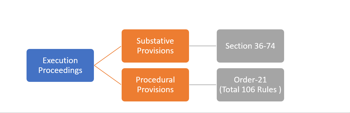 A file a suit against B for Rs 10,000 and obtains a decree against him. Here A is the decree-holder. B is the judgment-debtor, and the amount of Rs 10,000 is the judgment- debt or the decretal amount. Since the decree is passed against B, he is bound to pay Rs 10,000 to A. Suppose in spite of the decree, B refuses to pay the decretal amount to A, and A can recover the said amount from B by executing the decree through judicial process. The principle governing the execution of decree and orders are dealt with in Sections 36 to 74 (substantive law) and Order 21 of the code (procedural law).