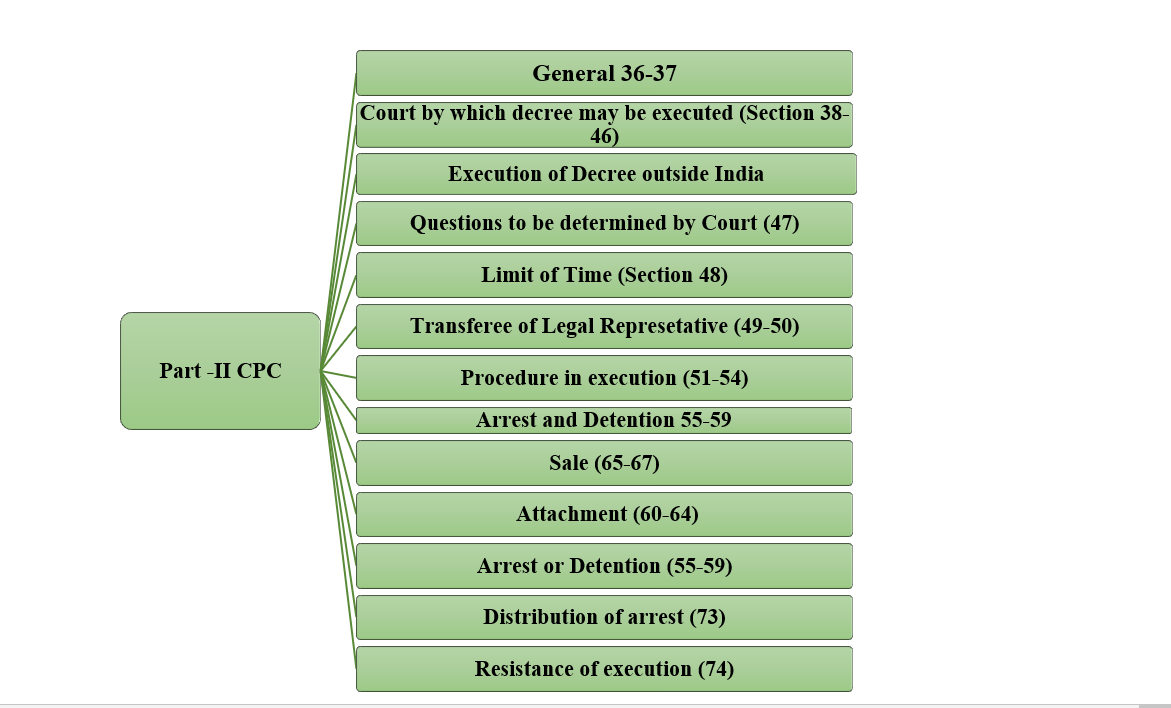 Term `Execution’ has not been defined in Code of Civil Procedure. However, expression “Execution” means enforcement of decrees and orders by the process of the court, so as to enable the decree holder to realise the fruits of the decree. The principles governing execution of decree and orders are dealt with in Sections 36 to 74 and Order 21 of the Civil Procedure Code.