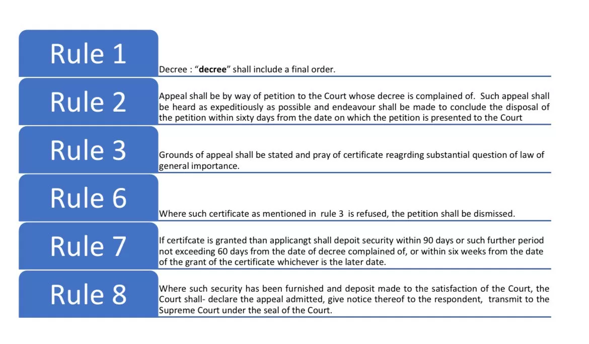 Order 45 of code of civil procedure regarding Appeal to Supreme Court: There are total 17 rules out of which some rules have been repealed. Some of the important rules are as follows :