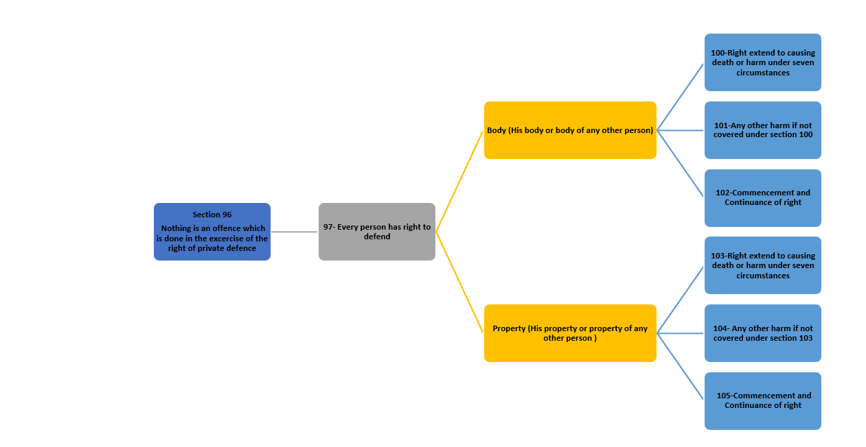 INTRO: The right of private defence has been recognized in the Indian Penal Code, 1860 under General Exceptions in the last 11 sections of Chapter IV starting with Section 96 and up to Section 106. Section 96 recognizes this right in a way too general sense while the remaining sections make provisions for varied forms of this right.